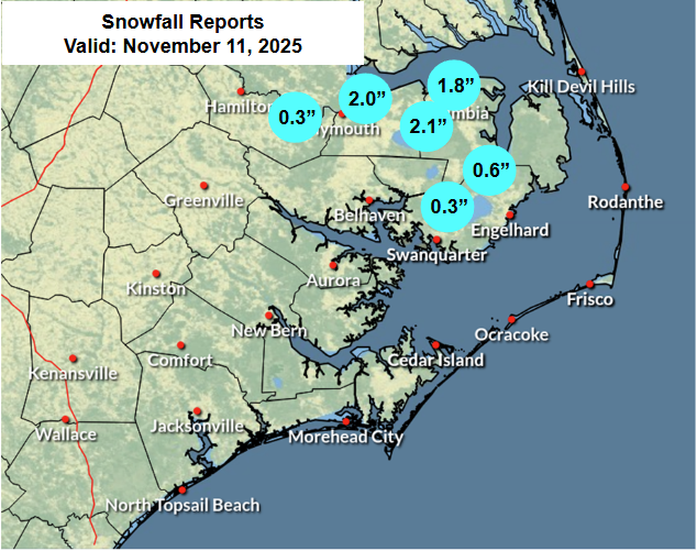 Edenton reported 0.2 inches on the ground in its earliest measurable snow on record dating back to 1895. Williamston and Plymouth each measured 0.3 inches, which was also their earliest snowfall in a season – and in Williamston, it happened almost two full weeks earlier than the previous record, which was set in 1935.