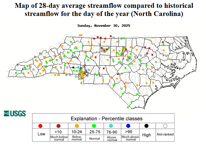 Among our recent drought impacts, streamflow levels continued to decline in November, Falls and Jordan lakes fell more than two feet below their targets, and on a few dry and windy days, wildfire activity flared up, including a 160-acre fire burning near Banner Elk and a 500-acre fire on the Roanoke River National Wildlife Refuge.