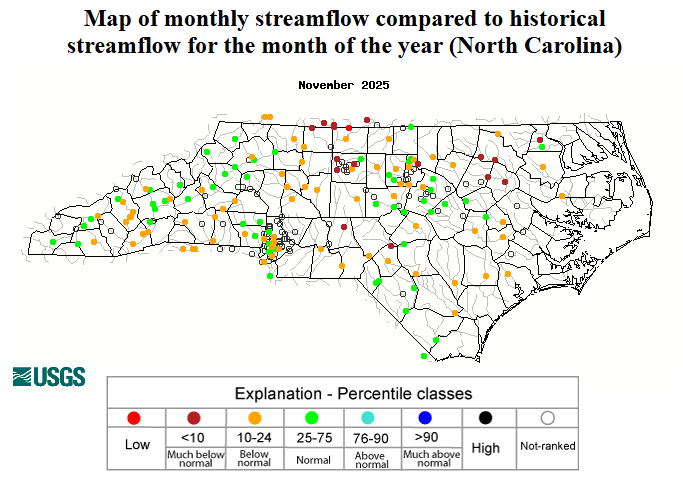 Despite those precipitation events, drought was a major storyline throughout the year, and the source of several other records. In March streamflows on the North Fork Swannanoa River in Buncombe County and Indian Creek in Lincoln County reached new monthly record low levels. And in both November and December, the Smith River at Eden bottomed out at new monthly record low streamflows.